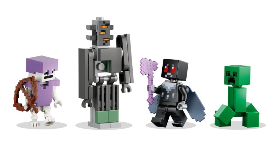 - 4 PERSONNAGES LEGO® MINECRAFT® – Un grinceur en briques affronte l’héroïque Homme-papillon ailé tandis qu’un Creeper™ et un squelette rôdent autour du biome du jardin pâle