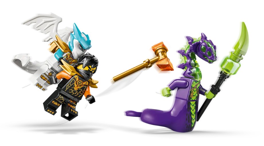 - 3 FIGURINES NINJAGO® – Cet ensemble LEGO® comprend Cole avec un marteau, Zane en forme dragon avec une épée et un monstre de l’acide avec un bâton pour que les amateurs puissent simuler des combats entre le bien et le mal