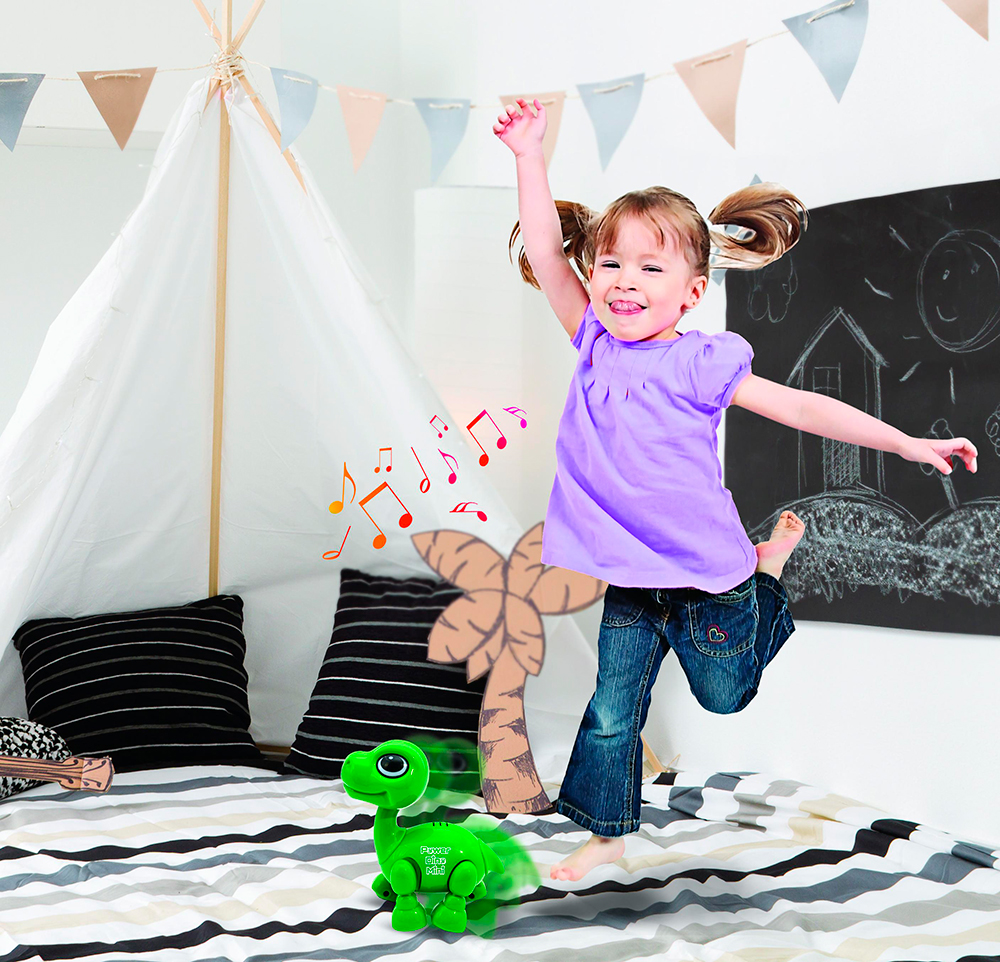 Le dinosaure répond à différentes commandes en fonction de la position de sa tête. Il suffit de déplacer la tête vers le bas pour passer en mode enregistrement, où il répète ce que disent vos enfants. En tournant la tête vers le haut, il réagit aux applaudissements - un claquement de mains le fait avancer, deux claquements le font reculer et trois claquements l'incitent à danser. Lorsque la tête est en position médiane, le robot s'éteint.