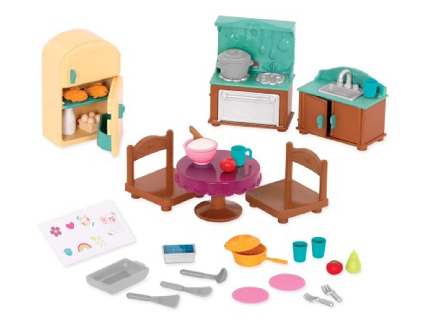Passez de bons moments en famille ou entre amis dans cette jolie cuisine!- Comprend 30 pièces : 1 évier, 1 cusinière, 1 réfrigérateur, 1 table, 2 chaises, 1 marmite, 1 poêlon, 1 plat allant au four, 2 verres, 2 tasses, 1 bac à glaçons, 2 grandes assiettes, 1 bouteille de lait, 1 bol à mélanger, 1 panier d’œufs, 1 tomate, 1 poire, 1 pomme, 2 poissons, 3 ustensiles de cuisine, 2 fourchettes et 1 feuille d’autocollants.