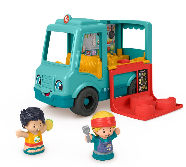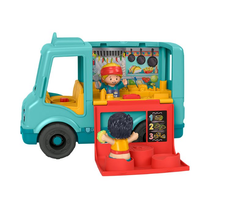 C’est le moment de commander! Les tout-petits peuvent commander, cuisiner et servir de délicieux jeux de rôles pendant des heures avec le Camion-restaurant Prêt à servir Little People® de Fisher-Price®. Lorsque les enfants appuient sur le bouton ou sur le siège du conducteur de ce jouet musical, ils entendent des chansons, des sons et des phrases pour rehausser le jeu. Le camion à tacos factice est équipé d’une cuisine de jeu, d’un coin repas dépliable et comprend 2 figurines Little People® pour jouer toutes sortes d’histoires amusantes!- Camion-restaurant jouet musical à pousser pour faire semblant de jouer à cuisiner et à rouler en véhicule!