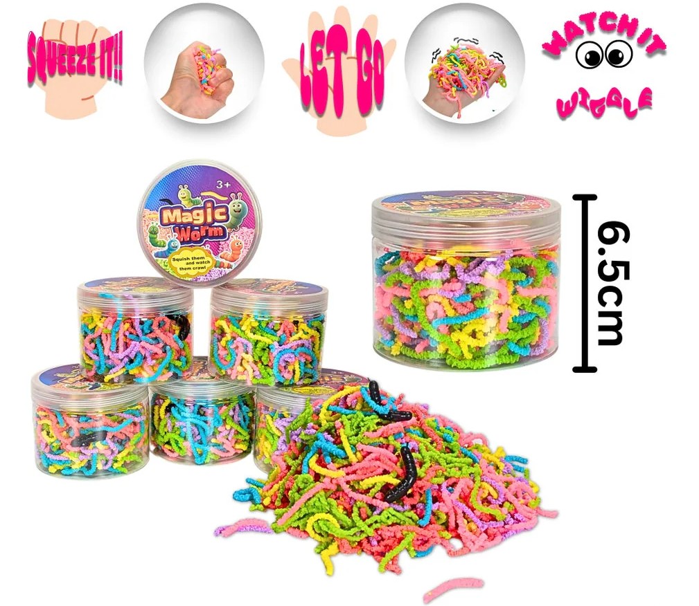Presse-les dans ta main… puis relâche-les pour les voir reprendre forme et “bouger” comme de vrais petits vers !