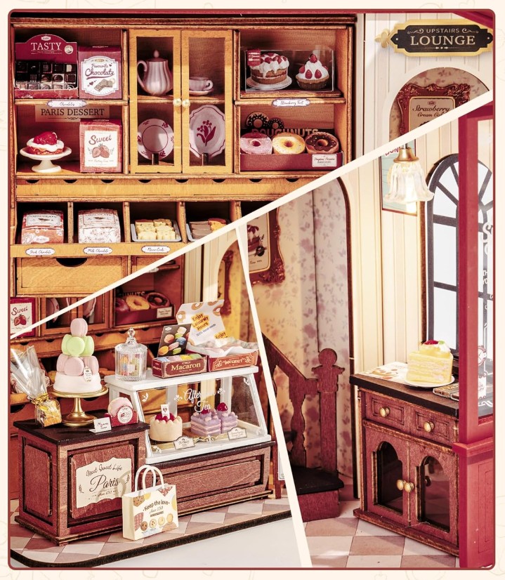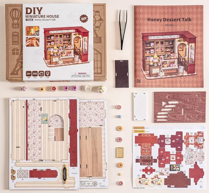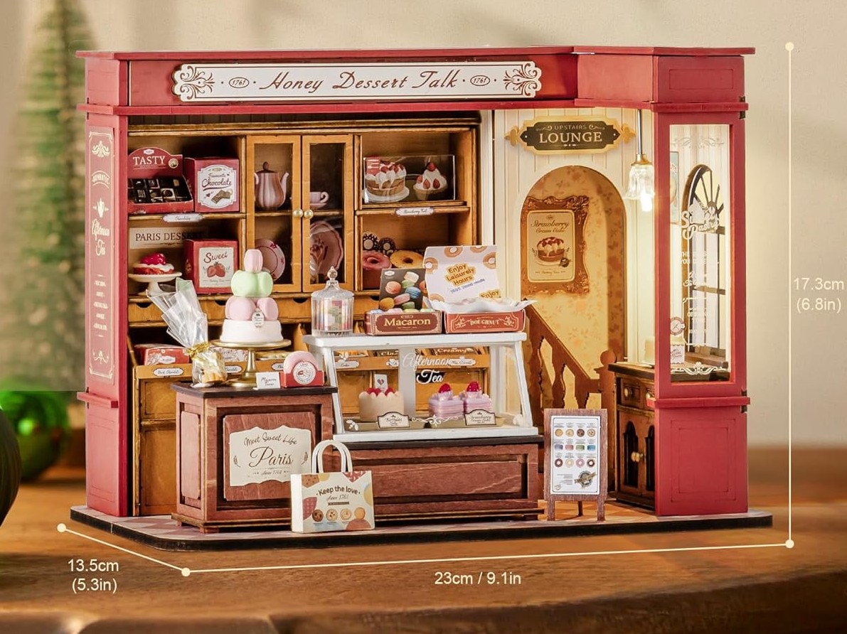 Il est temps de déguster de délicieuses friandises de Honey Dessert Talk, une pâtisserie française douce et élégante de Rolife. Ce modèle miniature à assembler est rempli de créations délicieuses habilement présentées dans de charmantes vitrines en verre et étagères en bois. Ajoutez ce modèle adorable à votre collection de maisons miniatures dès aujourd'hui !Necessite des 2x piles AAA, non incluses.