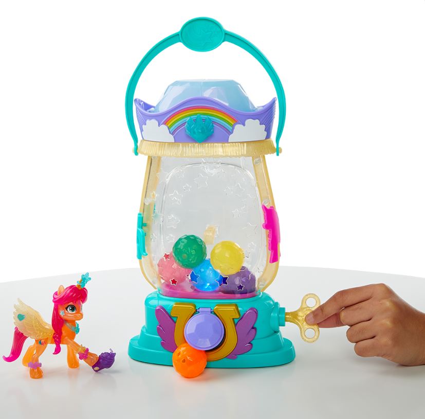 Inclut un poney orange Sunny Starscout de 7,5 cm avec comme marque de beauté une étoile filante inspirée de celle du personnage. La figurine est articulée et a une crinière rose en plastique, tressée dans son style emblématique. On tourne la clé de la lanterne inspirée du film pour que la lanterne s'illumine et distribue des contenants en forme de cristal. Des surprises sont cachées à l'intérieur de chaque contenant et même dans la partie supérieure de la lanterne ! On place les contenants en forme de cristal par-dessus la lumière de la lanterne pour changer la couleur de sa lueur. 6 couleurs différentes !