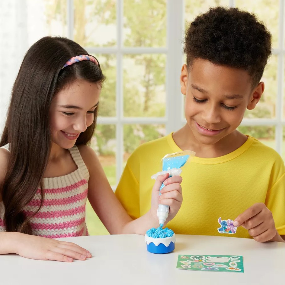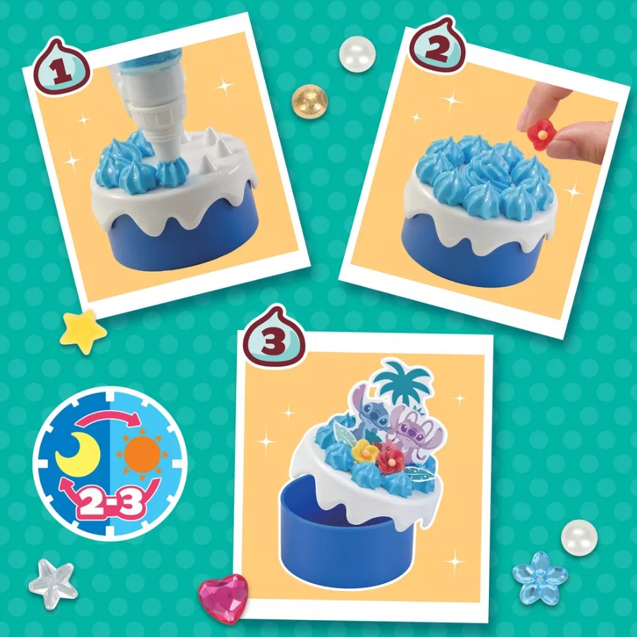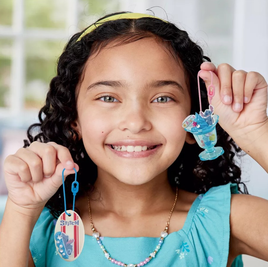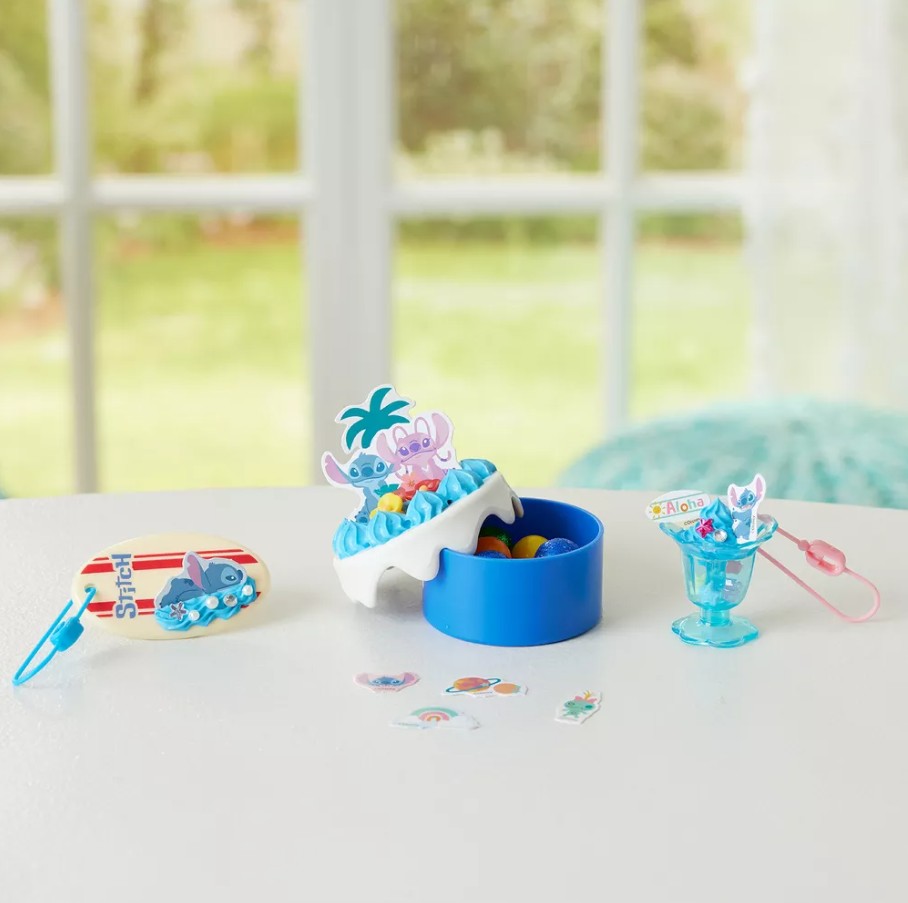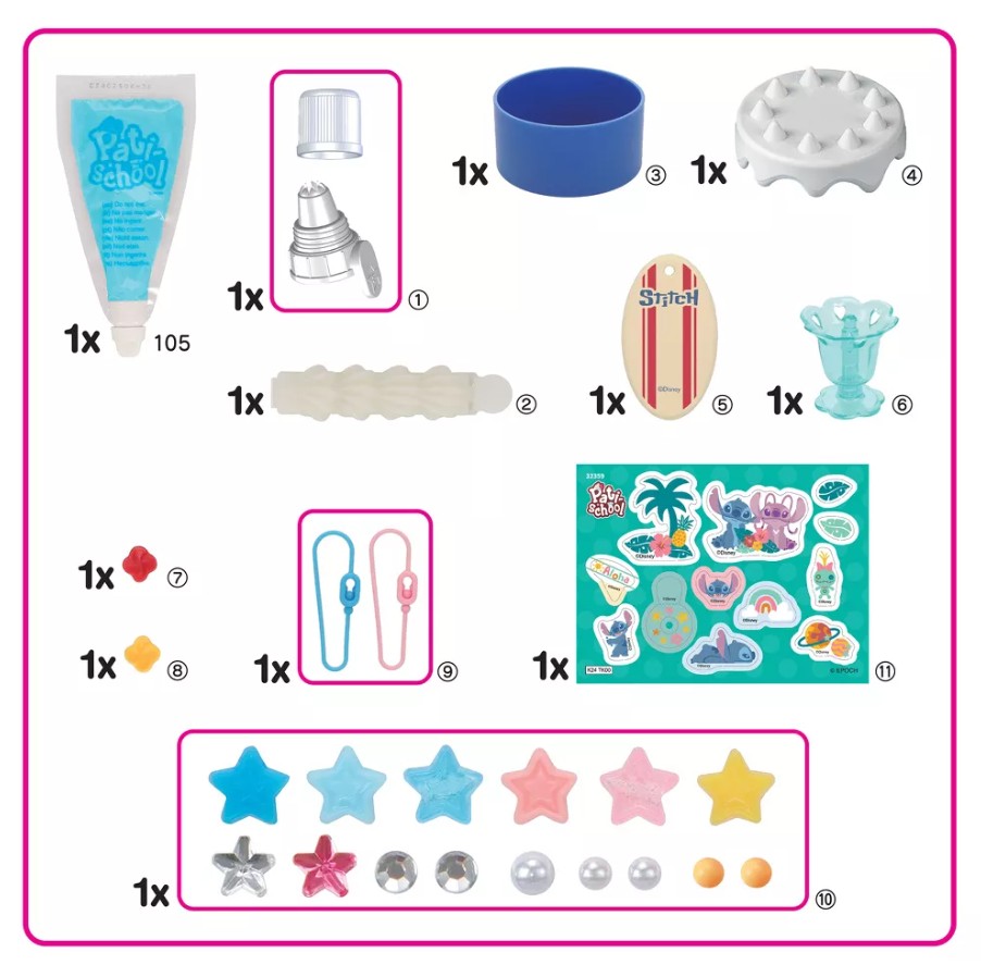 Le kit Stitch Creations contient de la pâte Pati-school, des perles et des strass, des décorations en papier inspirées de Stitch, et 3 supports différents pouvant servir de boîte à trésors ou de porte-clés !