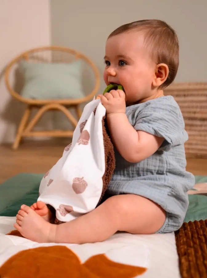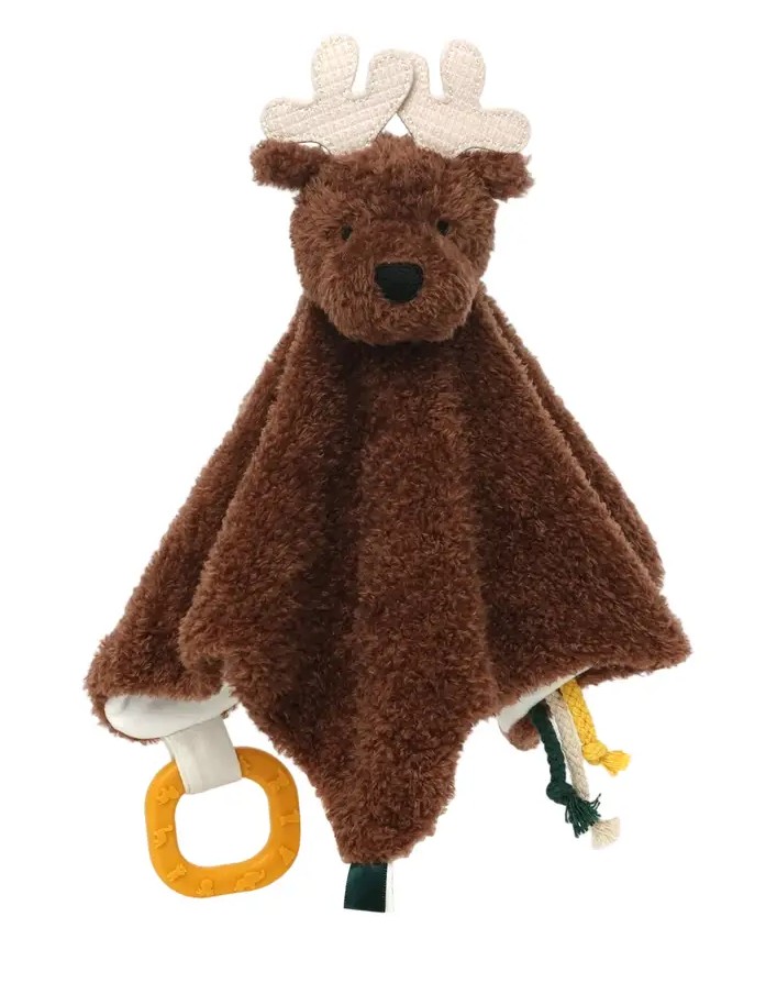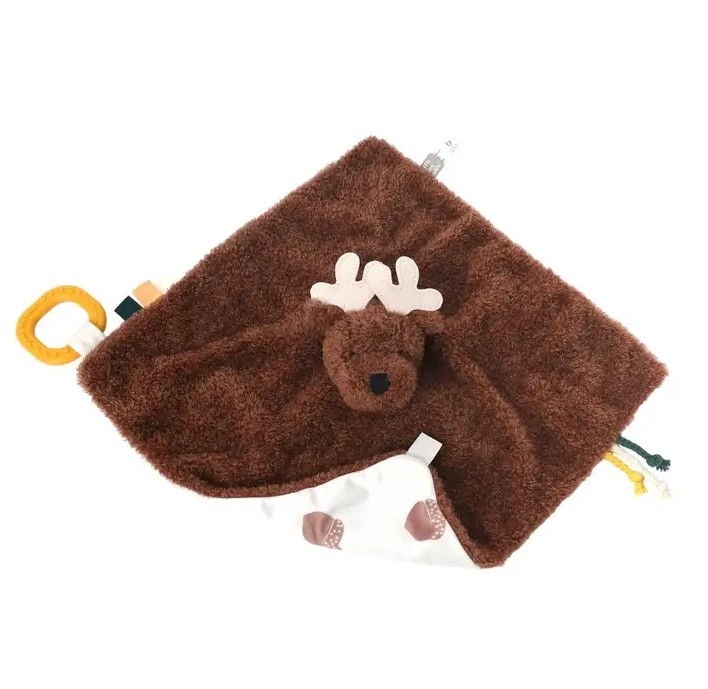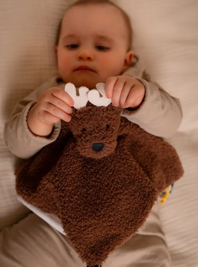 Le doudou Bruce l'Élan est parfait pour accompagner bébé dès ses premiers mois.Conçu avec des matières ultra-douces - un tissu bouclé moelleux et un imprimé forêt au toucher soyeux – il apporte douceur et réconfort. Avec ses différentes activités – 3 rubans, 3 cordons et 1 anneau de dentition – ce doudou stimule la curiosité et favorise le développement de la motricité fine. Sa forme plate, facile à manipuler par les petites mains, en fait un allié parfait pour les câlins, les jeux et les promenades en poussette.