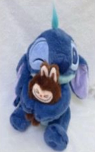 - Peluche douce et moelleuse représentant Stitch tenant Labubu dans ses bras.