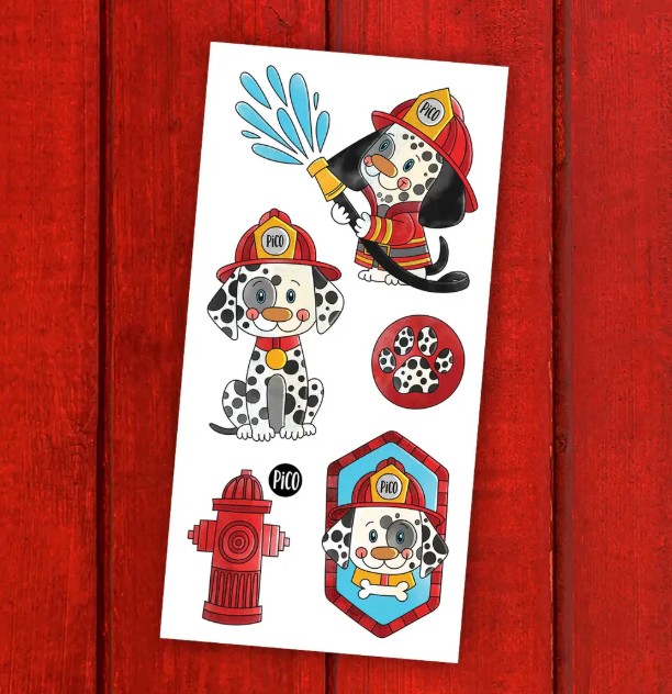 Pico le chien pompier et ses amis sont des soldats du feu passionnés par leur métier. Ils sont toujours prêts à intervenir et à éteindre des feux pour la sécurité du quartier. Les dalmatiens sont si mignons avec leurs nombreux picos.Cet emballage contient 1 feuille de tatouages temporaires d'un format de 2 pouces X 4 pouces.