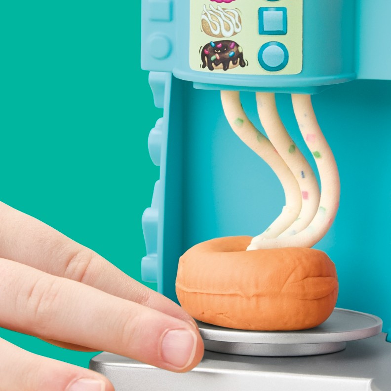 On peut s'amuser à créer des beignes avec ce coffret Play-Doh Le magasin de beignets !Les enfants peuvent créer 3 sortes de beignes différents (et plus) avec ce coffret Play-Doh. Il suffit de préparer le moule à beignes intégré pour créer un beigne élégant, fourré ou classique, puis ajouter de la pâte à modeler Play-Doh. Ensuite, on tourne la manivelle jusqu'à ce que le dessus s'ouvre et que les beignes factices tombent à la base ! On peut décorer ses créations avec la machine à glaçage, le tampon à glaçage, les vermicelles factices et les moules sur le coffret. On peut ajouter des croissants rigolos ou des boissons factices pour encore plus d'idées créatives.