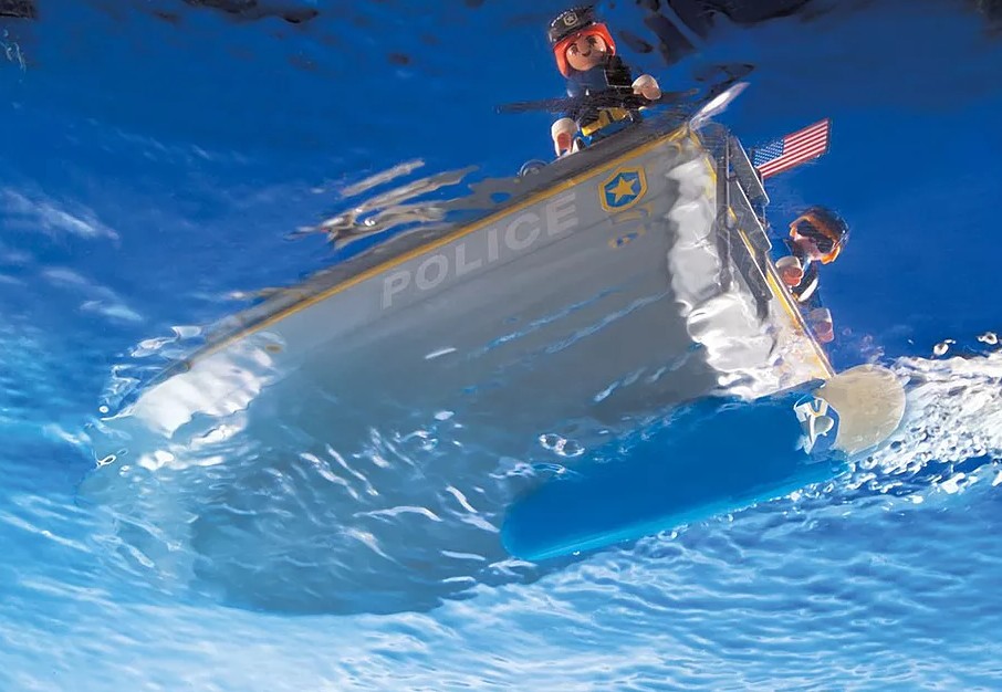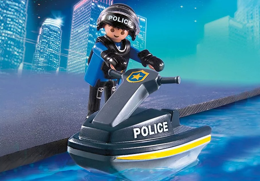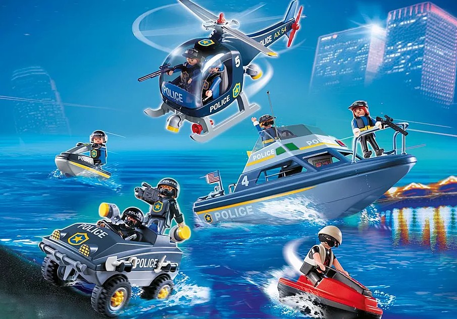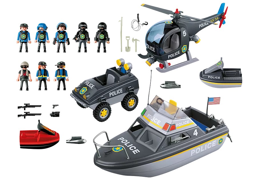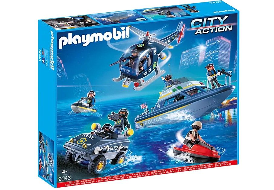 C'est une aventure passionnante la lutte contre la criminalité avec la police Tactical Unit. Que ce soit par mer, Air ou de la terre, la police est sur les lieux et prêt à attraper les méchants. L'hélicoptère de la police garde montre sur la ville grâce à son fonctionnement hélices et Spotlight. Le pilote a repéré un voleur en fuite, "ressemble il est capable de s'enfuir vers la mer." L'équipe entend le message depuis le centre de commande et les incendies jusqu "la police maritime avec moteur de fonctionnement pour attraper le voleur. L'officier de la police est à sa poursuite, alors qu'il tente de couper le voleur. "ressemble il est dirigé vers la terre." La police Quad rejoint la Chase, et ensemble, l'unité des forces spéciales, le voleur vers le rivage où les officiers sont prêt et en attente.L'ensemble comprend huit chiffres, hélicoptère, bateau de vitesse, deux embarcations personnelles, le fonctionnement du moteur, pelle, corde, caméra vidéo et beaucoup d'autres accessoires. Fonctionnement silencieux sur les deux Speed Boat ou Quad attraper les méchants en mer, Air ou de la terre comprend un hélicoptère, Speed Boat, deux jet skis et police Quad huit chiffres pour un jeu immersif.