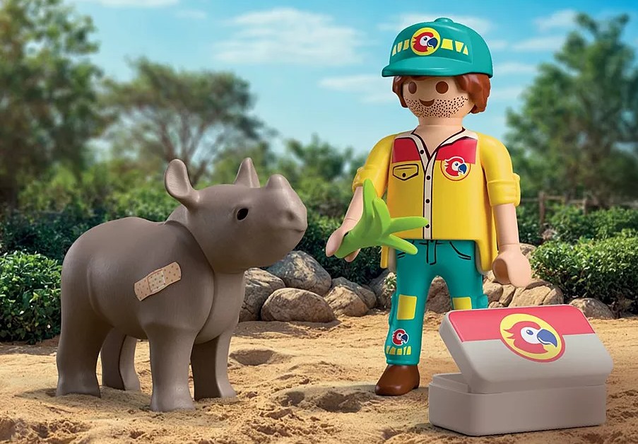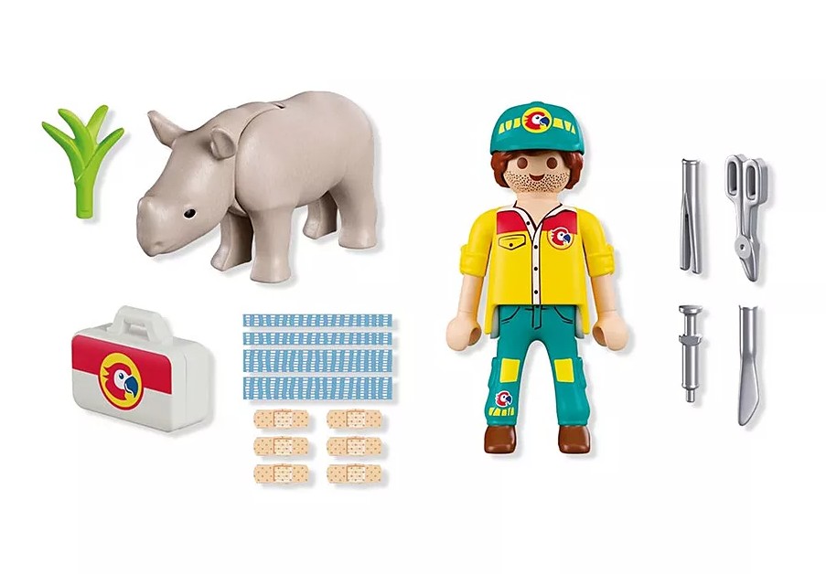 Dans le zoo moderne et spacieux de Playmo-City, le gardien d’animaux s’occupe avec amour d’un rhinocéros malade. Il ne veut pas manger et s’est fait mal en tombant –mais avec de la nourriture spéciale, des pansements et beaucoup de soins, le mignon petit animal va déjà bientôt se sentir mieux.Avec douceur et son kit médical bien utile, le ranger se met immédiatement à l’œuvre pour aider le petit rhino à guérir et à se sentir en sécurité. Les enfants peuvent soigner le patient avec des autocollants de bandage colorés et incliner sa tête pour donner vie à la scène. Ce DuoPack PLAYMOBIL attendrissant inspire le jeu d’empathie et de belles aventures au zoo. Une adorable addition à toute collection PLAYMOBIL dédiée aux animaux sauvages, idéale pour les jeunes amoureux des bêtes et les soigneurs en herbe !