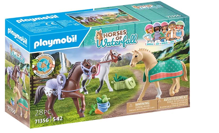 Le coffret comprend trois chevaux, des selles, une couverture pour cheval, des licols et de nombreux accessoires. Les nouveaux coffrets Horses of Waterfall sont fabriqués avec plus de 80% de matériaux recyclés ou biosourcés en moyenne.
