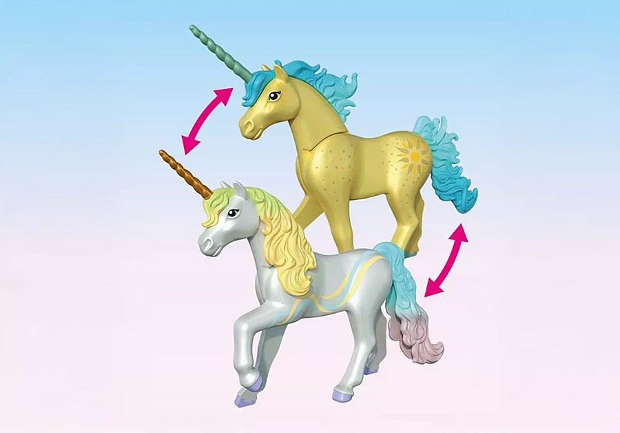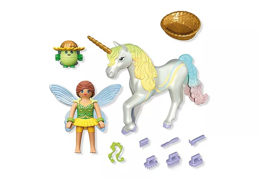 Rencontre la licorne Fleur arc-en-ciel et sa charmante amie fée ! Fleur arc-en-ciel est connue pour son lien particulier avec l'arc-en-ciel : sa présence éblouissante apporte de la couleur et de l'espoir au royaume des licornes. La charmante fée est accompagnée de son adorable compagnon, le Joyling, qui l’aide avec joie et dévouement à s'occuper de la licorne. La crinière, la queue et la corne de la licorne sont interchangeables. Il est ainsi possible, avec d'autres licornes de la nouvelle série de licornes PLAYMOBIL, de créer des licornes individuelles et uniques !Entrez dans un monde étincelant de magie avec Fleur d'Arc-en-ciel, la licorne scintillante qui adore tout ce qui est coloré ! Accompagnée de sa fée et du malicieux Magicamiz, elle répand la joie à travers le Royaume des Licornes. Grâce à sa crinière, sa queue et sa corne interchangeables, les enfants peuvent créer des licornes uniques en combinant les éléments avec ceux d’autres licornes PLAYMOBIL. Ce set féérique contient de charmants accessoires et des détails enchanteurs qui rendent chaque aventure encore plus magique. Parfait pour les petits rêveurs qui aiment la créativité, les paillettes et les histoires fantastiques !