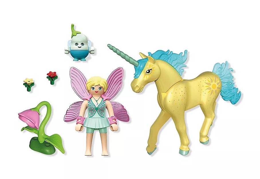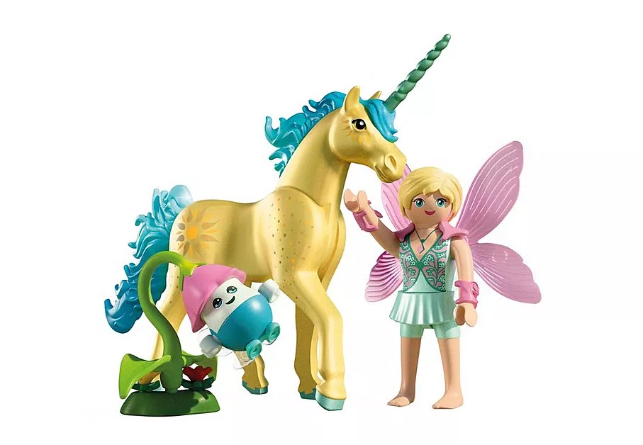 Rencontre la licorne Fleur solaire et sa charmante amie fée ! Les fées aiment Fleur solaire, car elle rend chaque jour un peu plus lumineux grâce à sa nature solaire. Sa confiance inébranlable en fait un allié de choix pour réussir facilement les tâches délicates. La charmante fée est accompagnée de son adorable compagnon, le Joyling, qui l’aide avec joie et dévouement à s'occuper de la licorne. La crinière, la queue et la corne de la licorne sont interchangeables. Il est ainsi possible, avec d'autres licornes de la nouvelle série de licornes PLAYMOBIL, de créer des licornes individuelles et uniques !Bienvenue dans un monde rempli de soleil et d’éclat ! Fleur de Soleil apporte la joie partout où elle passe, accompagnée de sa fée complice et du Magicamiz. Entourée de fleurs en pleine floraison et rayonnante de bonne humeur, cette licorne lumineuse inspire des aventures magiques et des histoires pleines de tendresse. Les enfants peuvent interchanger la crinière, la queue et la corne de Fleur de Soleil avec celles des autres licornes de la collection PLAYMOBIL pour créer des créations uniques et étincelantes. Avec ses accessoires enchanteurs et ses détails colorés, ce set PLAYMOBIL est parfait pour illuminer chaque moment de jeu !