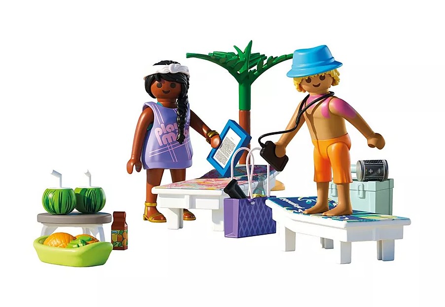 Rêvez-vous de partir en vacances à la plage ? C'est chose faite pour notre couple de vacanciers qui se repose sur leurs transats. Comprend deux personnages, deux transats et de nombreux accessoires.Place à la détente à la plage PLAYMOBIL ! Ce set du couple de vacancier à la plage déborde d’ambiance estivale : transats confortables, boissons fruitées, palmier ombragé et même une tenue interchangeable pour la femme. Le personnage masculin présente un imprimé sensible aux UV qui laisse apparaître un coup de soleil lorsqu'il est au soleil — attention à bien mettre de la crème solaire ! Le sac de plage et la glacière peuvent être remplis avec tous les accessoires nécessaires pour une journée parfaite au bord de la mer. Avec ses nombreux détails amusants, ce set PLAYMOBIL est idéal pour inventer des scènes de vacances relaxantes et des histoires pleines de soleil.