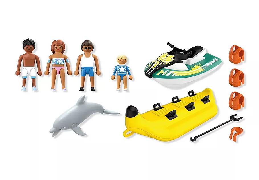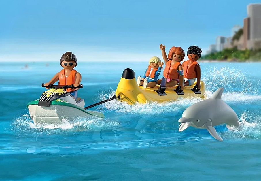 Voulez-vous essayer une nouvelle activité nautique ? Optez pour la bouée banane tractée par un scooter des mers ! Comprend un scooter des mers, une bouée banane, quatre personnages, un dauphin et de nombreux accesoires.Accrochez-vous bien… c’est l’heure de la banane tractée ! Avec de la place pour trois personnages, des poignées latérales solides et un scooter des mers prêt à tracter, ce set PLAYMOBIL promet des aventures pleines de vitesse et d’éclaboussures. Que ce soit pour filer sur les vagues ou jouer aux côtés du dauphin, le plaisir est toujours au rendez-vous. Le scooter des mers peut accueillir un personnage et se relie facilement au bateau banane grâce à la barre de traction incluse. Les gilets de sauvetage amovibles garantissent une sortie en toute sécurité. Avec quatre personnages, un dauphin et une ambiance bord de mer dynamique, ce set coloré est idéal pour s’inventer des vacances riches en action et en rires !