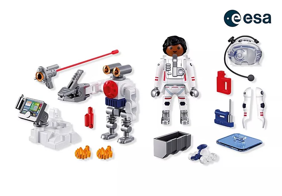 Développé en coopération avec l'Agence spatiale européenne (ESA) – PLAYMOBIL apporte la fascination de l’exploration de l’espace directement dans la chambre des enfants ! Avec son fidèle robot, compagnon agile et rapide sur Mars, l’astronaute collecte des échantillons passionnants sur la planète rouge. Le robot à bras articulé aide à ramasser les pierres,et à explorer même les endroits les plus difficiles d’accès. Parfait donc pour compléter la grande mission sur Mars – idéal pour les petit(e)s chercheurs/ chercheuses et explorateurs/ exploratrices en herbe !D’étranges signaux traversent le sol martien, guidant l’astronaute et son robot vers de nouvelles découvertes. Avec des gestes précis, les échantillons sont fixés sur la station d’analyse, où l’écran rotatif aide à examiner chaque fragment lumineux. Le robot passe aisément de la position assise à debout pour assister la mission, tandis que le mini-bot file devant pour collecter les plus petits éléments. Écran inclinable, outils robustes et porte-sac à dos pour transporter les roches : chaque instant ajoute à l’excitation. Ce set ESA PLAYMOBIL transforme chaque moment en une aventure de recherche captivante pour les explorateurs en herbe !