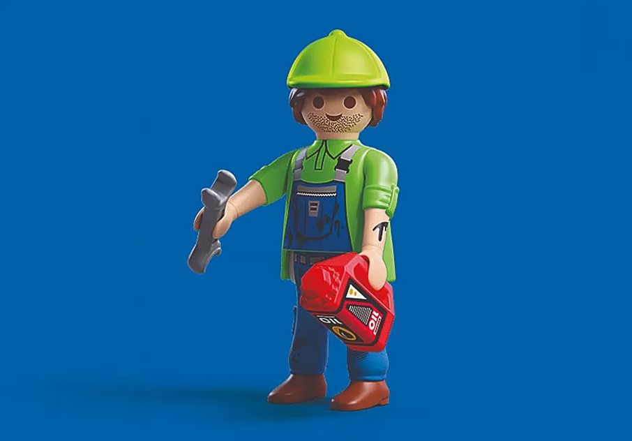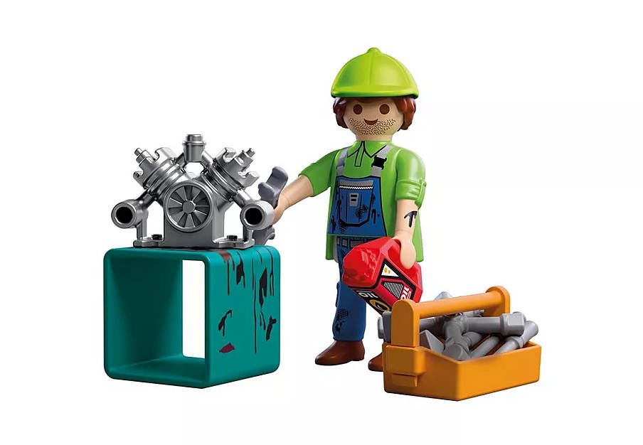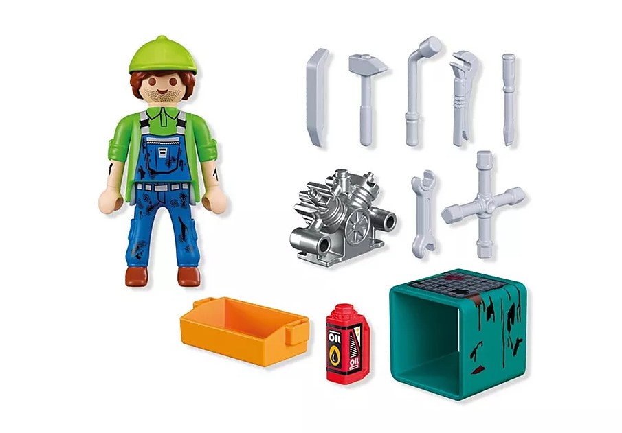 Mécanicien PLAYMOBIL Special Plus. Le mécanicien est prêt pour la prochaine intervention ! Avec une clé à molette, un bidon d'huile et une boîte à outils pleine, il remet tous les moteurs en marche !Dans un atelier animé où cliquettent les outils et ronronnent les moteurs, le mécanicien PLAYMOBIL talentueux relève chaque défi avec assurance. Qu’il s’agisse d’affiner un moteur capricieux ou de trier des pièces, il sait exactement quel outil saisir. L’établi solide et le bloc moteur offrent tout l’espace nécessaire pour des réparations pratiques, tandis que la grande boîte à outils garde tout bien rangé et prêt à l’emploi. Ce set détaillé invite à des aventures de garage créatives pour les mécaniciens en herbe – un ajout parfait à toute collection PLAYMOBIL !