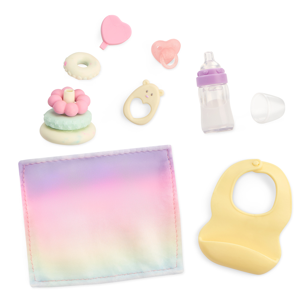 Tory vient d'être promue grande sœur. Au programme aujourd'hui? Les accessoires thématiques offrent aux enfants tout le nécessaire pour jouer à la baby-sitter et prendre soin de Riley. La couverture et les jouets à empiler créent un espace de jeu amusant. De plus, le biberon interactif est rempli de lait factice pour rendre l'heure du repas encore plus amusante! Tory et Riley sont livrées avec des tenues faciles à changer et des bandeaux assortis. Un bavoir, un anneau de dentition et une tétine adaptée à la bouche de Riley complètent son adorable look.