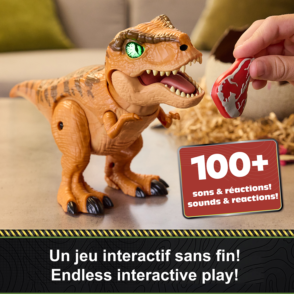 Donnez vie à votre dinosaure en le regardant éclore pour la toute première fois. Ce jouet dinosaure pour garçons et filles vous permet d'assister à la naissance de votre bébé T-Rex, puis de décider s'il devient un ami ou un prédateur féroce. Doté de fonctions articulées, de plus de 100 effets sonores et réactions et de modes de jeu interactifs, le T-Rex Hatch Primal est idéal pour divertir votre jeune fan de Jurassic Park pendant des heures. Tout d'abord, faites éclore le T-Rex en tapotant plusieurs fois sur l'œuf, puis regardez la coquille se fissurer et votre bébé dinosaure apparaître à travers la membrane gluante de son œuf. Utilisez le clicker et la nourriture pour dresser le féroce dinosaure pour qu'il devienne un ami, ou regardez-le évoluer en un dangereux prédateur ; vous seul décidez de son avenir. Le T-Rex Primal Hatch fera un fantastique ajout à votre collection de jouets de dinosaures ou de jouets Jurassic. Ajoutez-le à votre liste de souhaits pour des cadeaux de Noël, à l'occasion des fêtes ou d'un anniversaire. Jouet pour garçons et filles à partir de 5 ans.